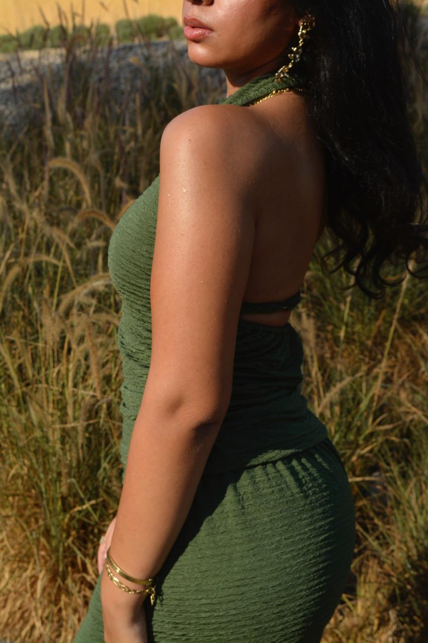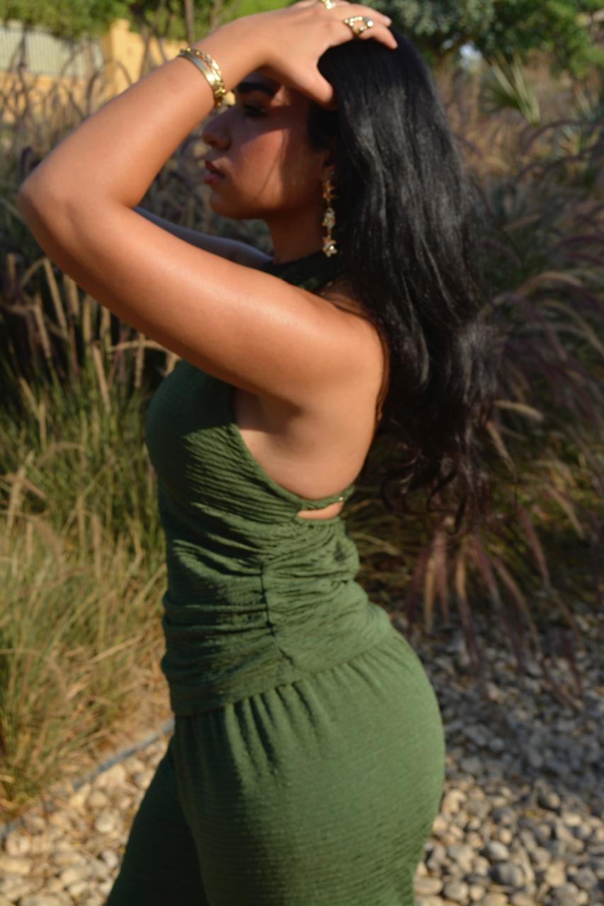 Elevate your wardrobe with this effortlessly chic Textured Olive Green Set, crafted for the modern muse. Featuring a high-neck, sleeveless draped top and matching wide-leg pants, this co-ord set blends comfort with contemporary sophistication. The soft, crinkled fabric adds dimension and movement, while the flattering ruched detailing hugs in all the right places.